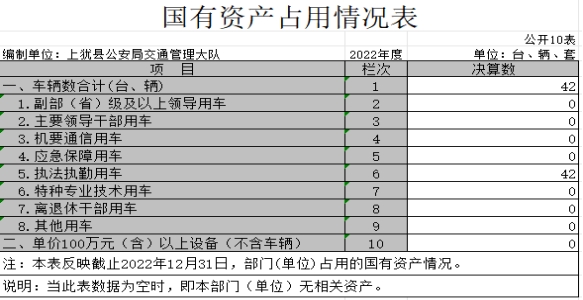 本部門共有車輛42輛,其中:副部(?。┘?jí)及以上領(lǐng)導(dǎo)用車0輛、主要領(lǐng)導(dǎo)干部用車0輛、機(jī)要通信用車0輛、應(yīng)急保障用車0輛、執(zhí)法執(zhí)勤用車13輛、特種專業(yè)技術(shù)用車3輛、離退休干部用車0輛、警用摩托車26輛,其他用車0輛,單價(jià)100萬(wàn)元(含)以上設(shè)備0臺(tái)(套)。