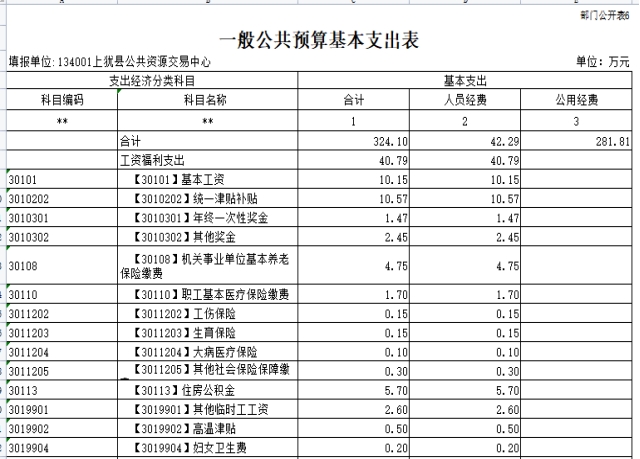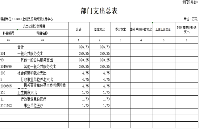 按支出功能科目劃分:一般公共服務支出320.25萬元,占支出預算總額的98.02%;社會保障和就業(yè)支出4.75萬元,占支出預算總額的1.46%;醫(yī)療衛(wèi)生支出1.7萬元,占支出預算總額的2.77%。