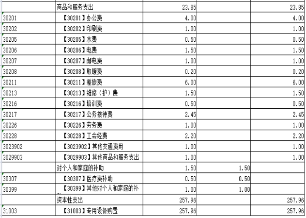 其中:按支出項目類別劃分:基本支出326.7萬元,占支出預算總額的100%,包括工資福利支出43.37萬元、商品和服務支出23.85萬元、對個人和家庭的補助支出1.5萬元;資本性支出257.96萬元。