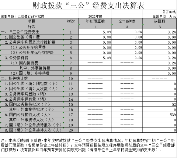 (五)“三公”經(jīng)費支出:指用財政撥款安排的因公出國(境)費、公務(wù)用車購置及運行維護費和公務(wù)接待費。其中,因公出國(境)費反映單位公務(wù)出國(境)的國際旅費、國外城市間交通費、住宿費、伙食費、培訓(xùn)費、公雜費等支出;公務(wù)用車購置及運行維護費反映單位公務(wù)用車車輛購置支出(含車輛購置稅、牌照費),按規(guī)定保留的公務(wù)用車燃料費、維修費、過橋過路費、保險費、安全獎勵費用等支出;公務(wù)接待費反映單位按規(guī)定開支的各類公務(wù)接待(含外賓接待)支出。