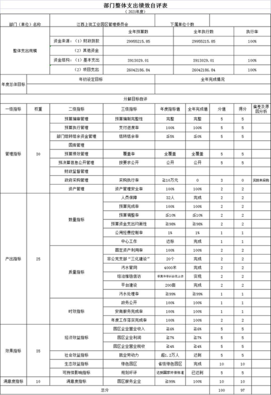 根據(jù)部門整體支出績效評價(jià)指標(biāo)體系,2021年度評價(jià)得分為97分。