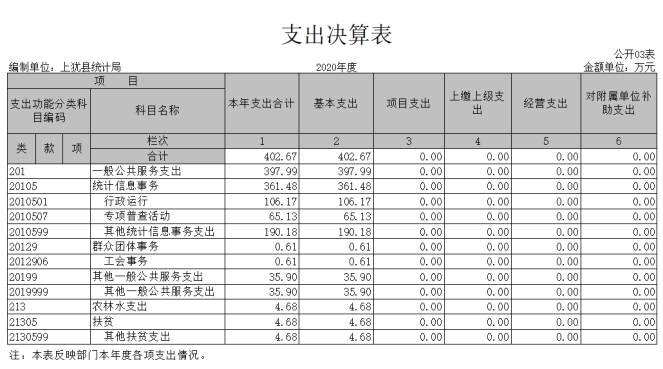 本年支出的具體構(gòu)成為:基本支出402.7萬元,占100%;項目支出0萬元,占0%;經(jīng)營支出0萬元,占0%;其他支出(對附屬單位補助支出、上繳上級支出)0萬元,占0%。