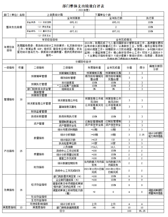 組織開展部門整體支出績效評價(jià),涉及一般公共預(yù)算支出697.81萬元,政府性基金預(yù)算支出0萬元。從評價(jià)情況來看,2021年全年印發(fā)統(tǒng)計(jì)月度資料12期,統(tǒng)計(jì)分析期數(shù)15期,開展統(tǒng)計(jì)培訓(xùn)7次,配合上級部門對10家單位(企業(yè))進(jìn)行執(zhí)法檢查,保障工作人員不少于16人,政府中心工作按時(shí)保質(zhì)完成,統(tǒng)計(jì)分析質(zhì)量達(dá)標(biāo),完成了普查后續(xù)工作,定期發(fā)布統(tǒng)計(jì)數(shù)據(jù),為部門及時(shí)提供數(shù)據(jù),在統(tǒng)計(jì)分析撰寫能力方面有待提高。部門整體支出績效指標(biāo)設(shè)定不夠完善,今后將根據(jù)具體工作加強(qiáng)細(xì)化,對預(yù)期目標(biāo)值的設(shè)定更符合實(shí)際情況。