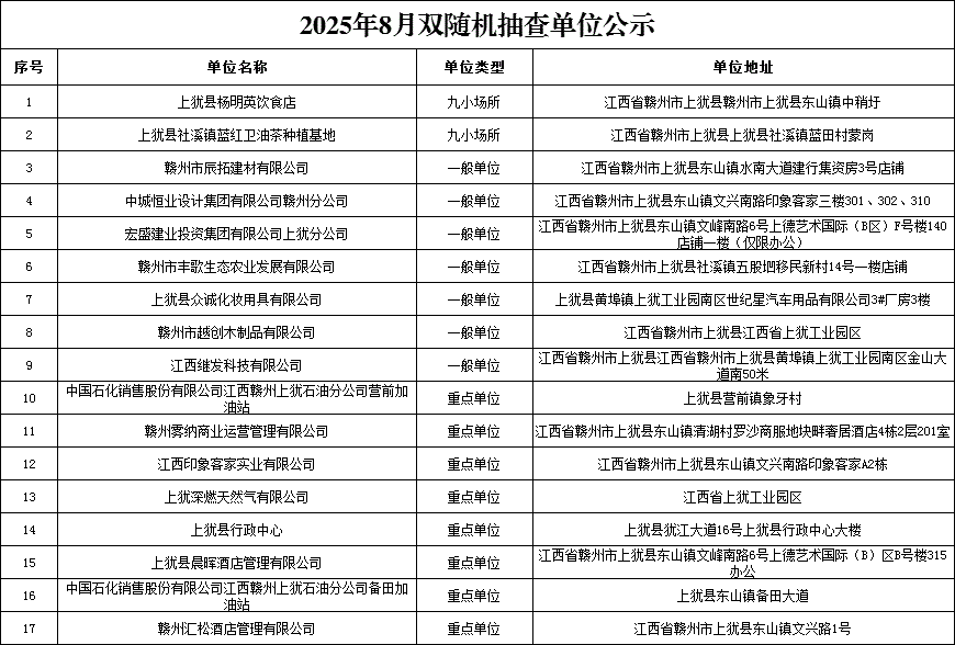 2025年8月雙隨機抽查單位公示