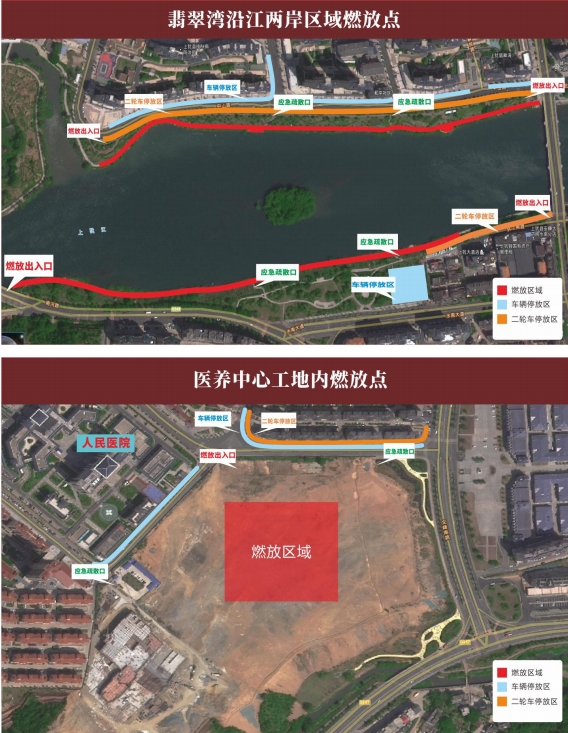 可燃放區(qū)域位于為翡翠灣沿江兩岸和醫(yī)養(yǎng)中心項(xiàng)目工地內(nèi)(具體區(qū)域詳見附圖),實(shí)行定時、定點(diǎn)燃放煙花。