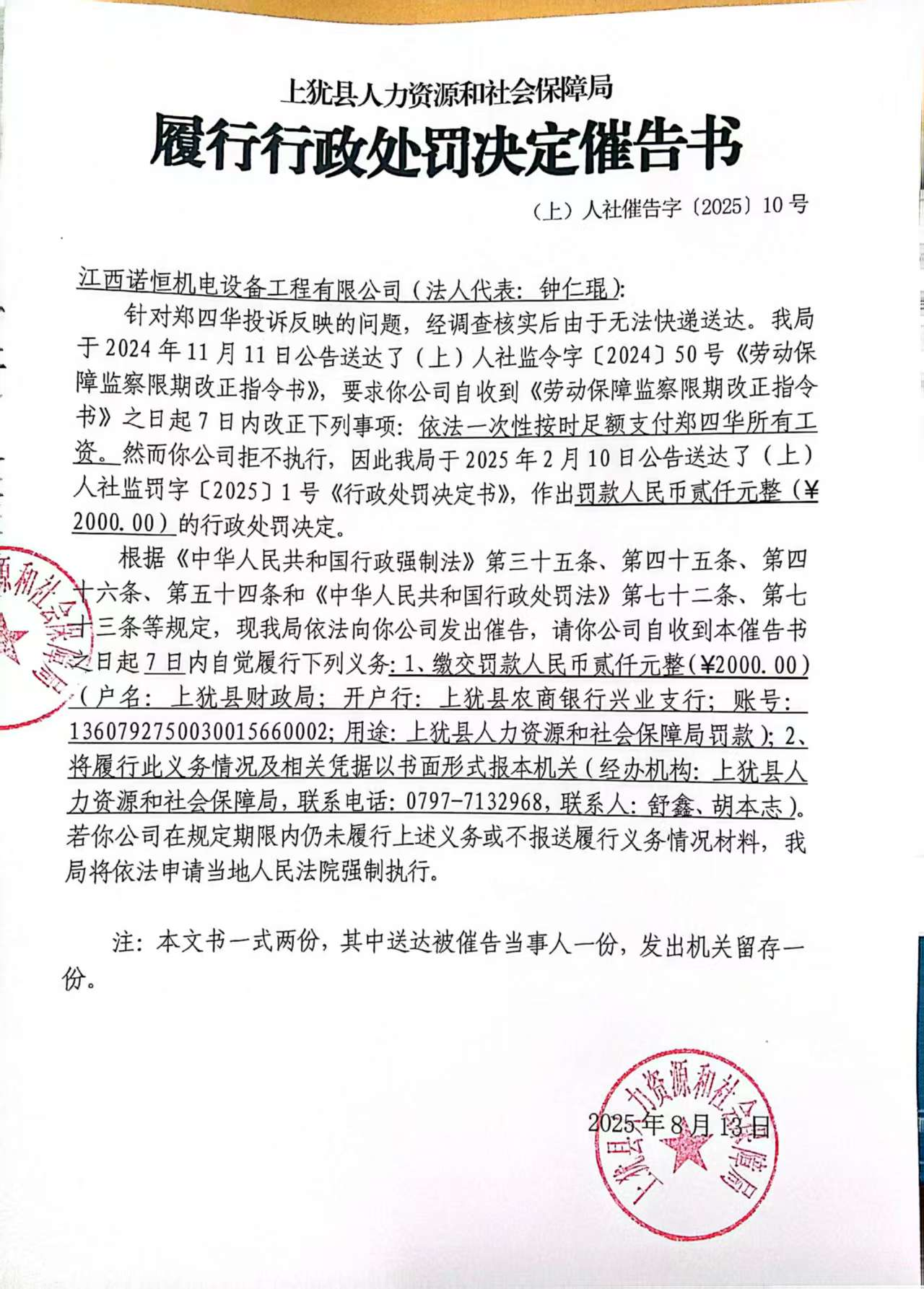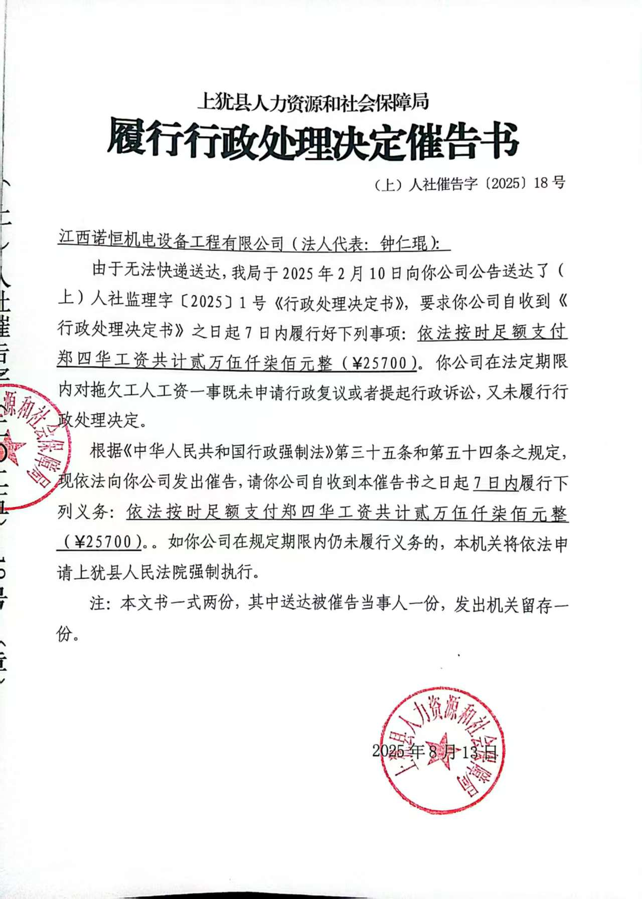 我局接到鄭四華投訴你公司未按時(shí)足額支付工人工資一案,因無法通過直接送達(dá)及郵寄方式送達(dá)(上)人社催告字〔2025〕18號(hào)《履行行政處理決定催告書》、(上)人社催告字〔2025〕10號(hào)《履行行政處罰決定催告書》?,F(xiàn)依照有關(guān)規(guī)定向你(單位)公告送達(dá),公告時(shí)間(2025年8月15日-2025年9月15日),公告期滿即視為送達(dá)成功。