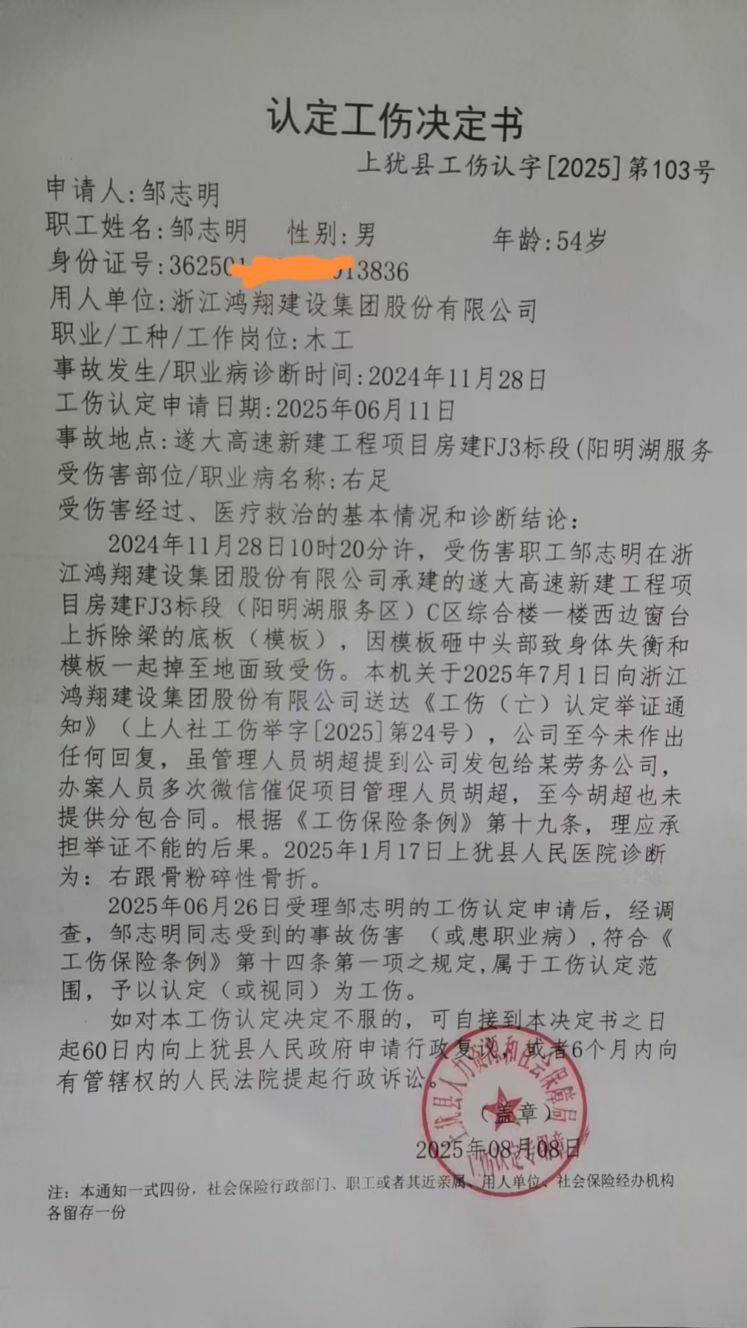 2024年11月28日10時20分許,受傷害職工鄒志明在浙江鴻翔建設集團股份有限公司承建的遂大高速新建工程項目房建FJ3標段(陽明湖服務區(qū))C區(qū)綜合樓一樓西邊窗臺上拆除梁的底板(模板),因模板砸中頭部致身體失衡和模板一起掉至地面致受傷。本機關于2025年7月1日向浙江鴻翔建設集團股份有限公司送達《工傷(亡)認定舉證通知》(上人社工傷舉字〔2025〕第24號),公司至今未作出任何回復,雖管理人員胡超提到公司發(fā)包給某勞務公司,辦案人員多次微信催促項目管理人員胡超,至今胡超也未提供分包合同。根據(jù)《工傷保險條例》第十九條,理應承擔舉證不能的后果。2025年1月17日上猶縣人民醫(yī)院診斷為:右跟骨粉碎性骨折。