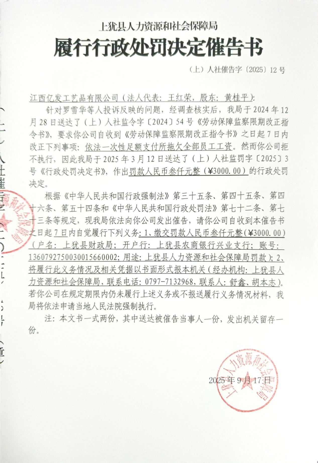 附件:《履行行政處罰決定催告書》(上)人社催告字〔2025〕12號、《履行行政處理決定催告書》(上)人社催告字〔2025〕22號