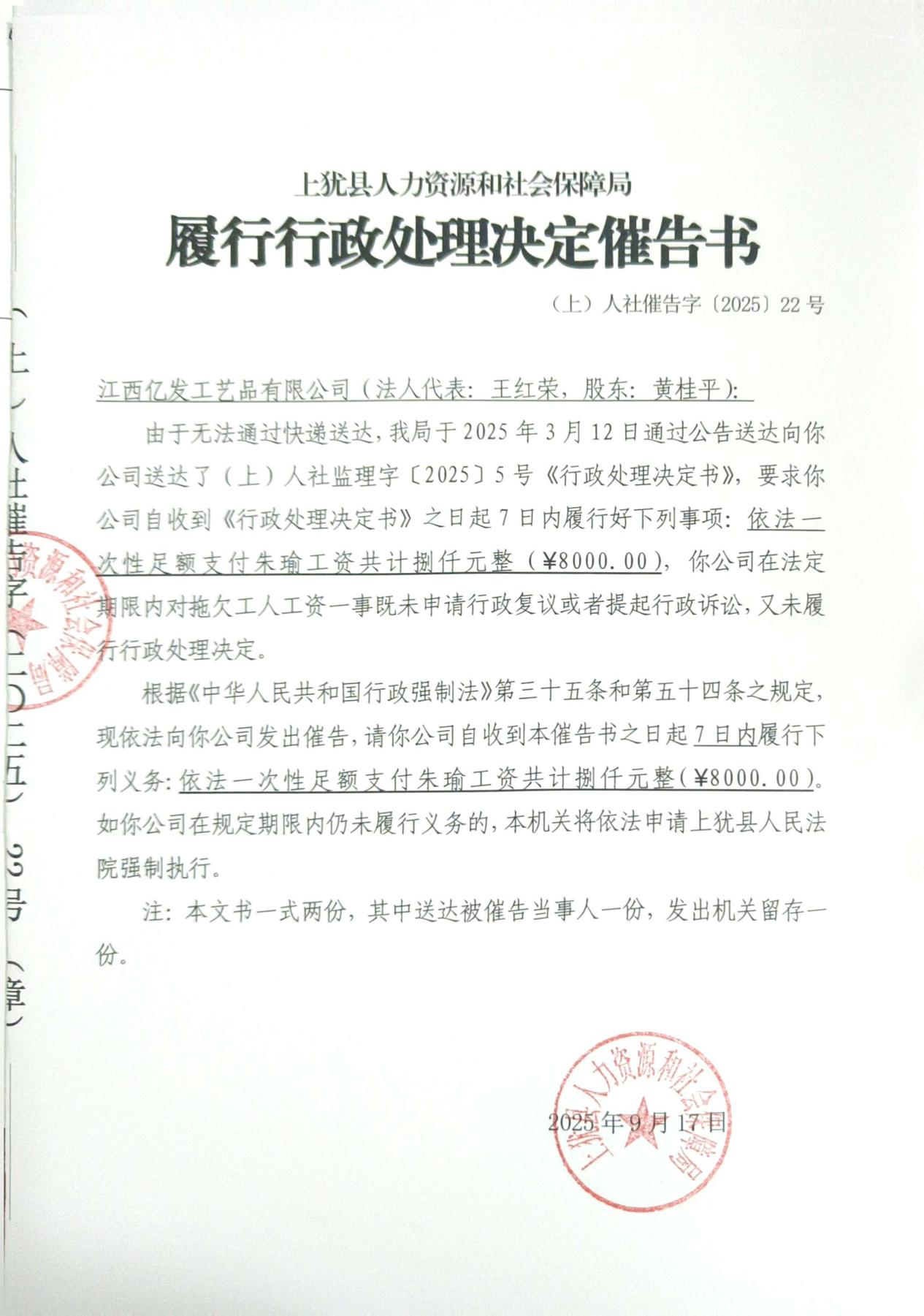 你公司未按時足額支付工人工資一案,因無法通過直接送達及郵寄方式送達《履行行政處罰決定催告書》(上)人社催告字〔2025〕12號、《履行行政處理決定催告書》(上)人社催告字〔2025〕22號?,F(xiàn)依照有關(guān)規(guī)定向你(單位)公告送達,公告時間(2025年9月18日-2025年10月18日),公告期滿即視為送達成功。
