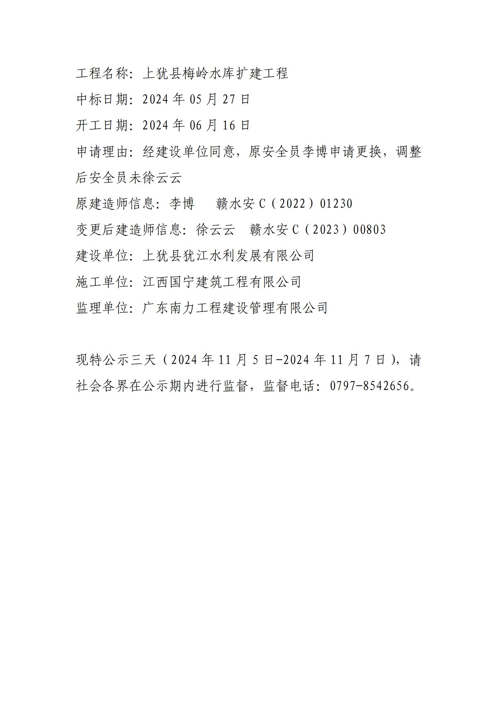 上猶縣梅嶺水庫擴建工程安全員人員變更公示