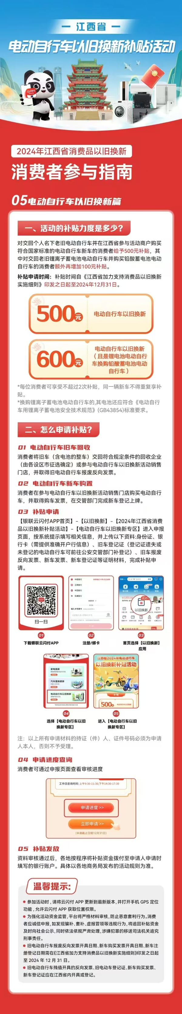 根據(jù)電動(dòng)自行車以舊換新政策,自2024年9月19日起至2024年12月31日,對(duì)交回個(gè)人名下老舊電動(dòng)自行車并在江西省購(gòu)買(mǎi)符合國(guó)家標(biāo)準(zhǔn)的電動(dòng)自行車新車的消費(fèi)者給予500元補(bǔ)貼,其中對(duì)交回老舊鋰離子蓄電池電動(dòng)自行車并購(gòu)買(mǎi)鉛酸蓄電池電動(dòng)自行車的消費(fèi)者額外再增加100元補(bǔ)貼。
