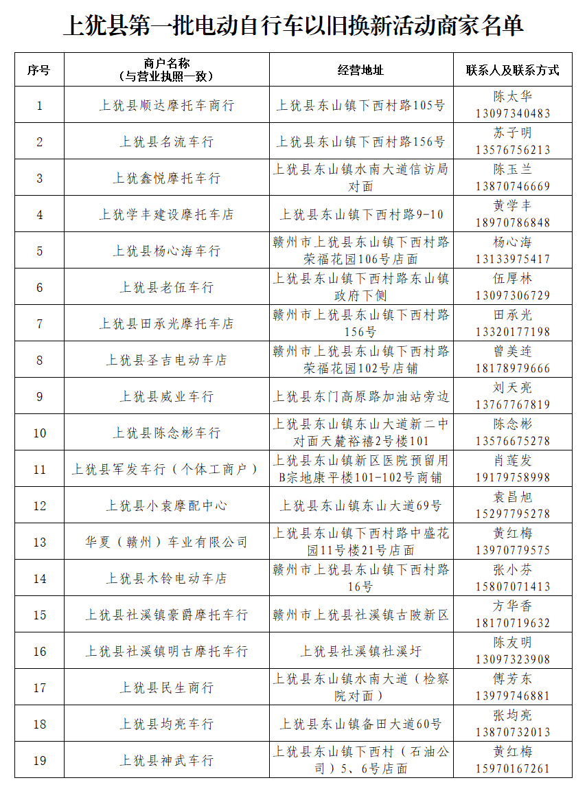 上猶縣電動(dòng)自行車以舊換新活動(dòng)商家名單出爐,經(jīng)過(guò)征集、遴選等程序并報(bào)上級(jí)商務(wù)部門(mén)審核通過(guò),我縣19戶電動(dòng)自行車商家入選。