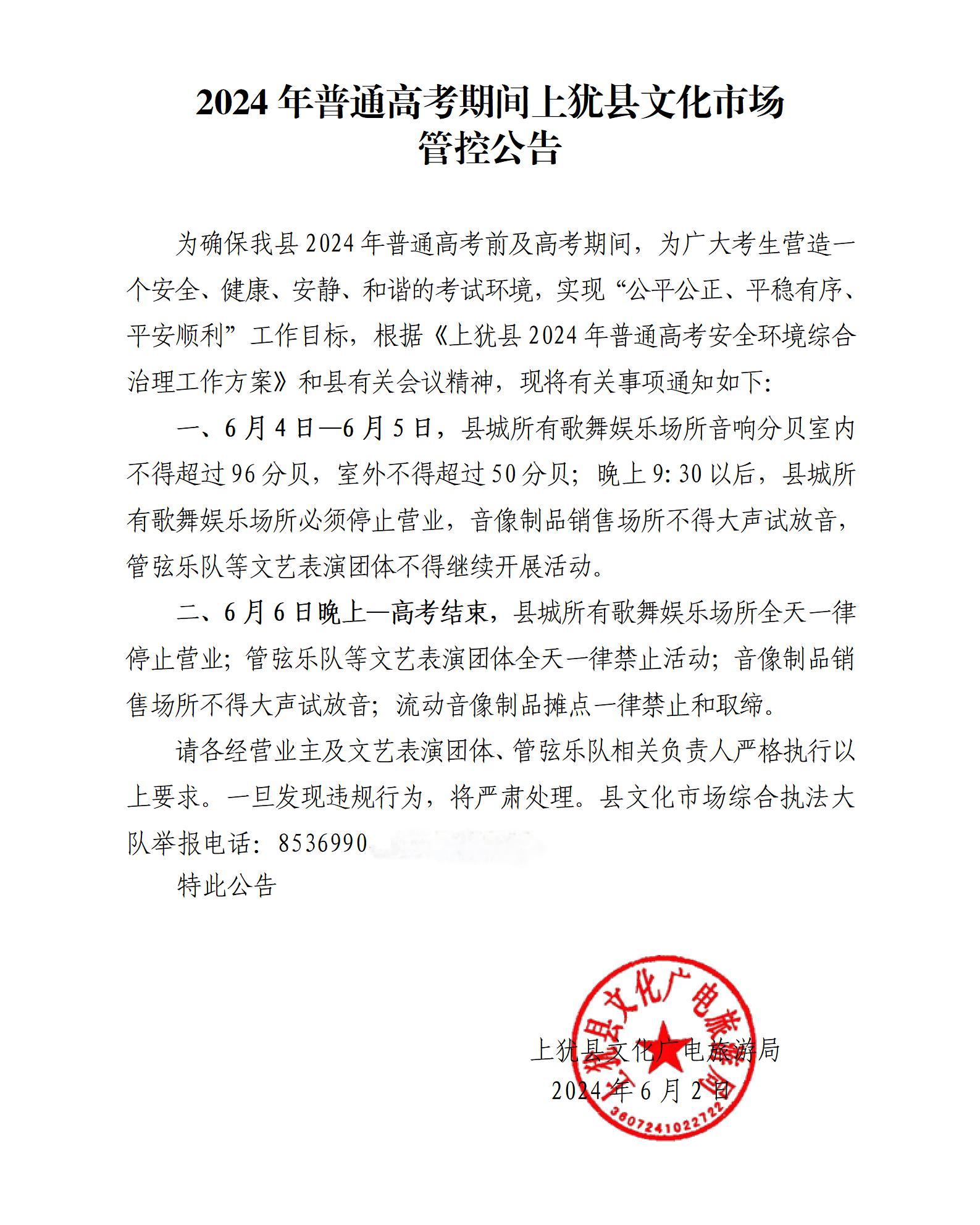 2024年普通高考期間上猶縣文化市場(chǎng)管控公告