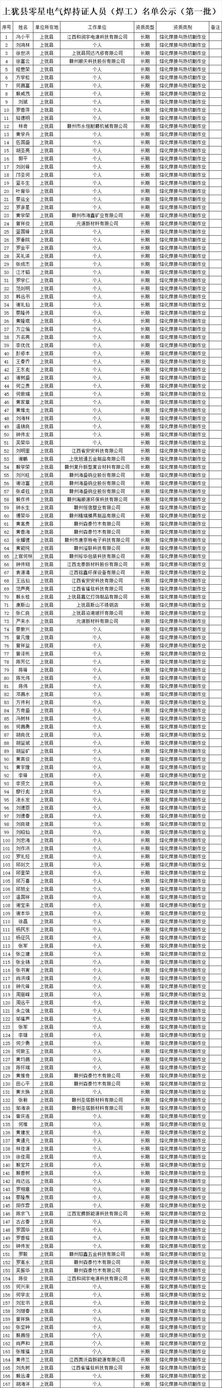 電氣焊屬于特種作業(yè),其作業(yè)過程具有高溫、熾熱、易燃、飛濺的特點(diǎn),違章操作極易引發(fā)火災(zāi)事故,危害極大,輕則造成財(cái)產(chǎn)損失,重則導(dǎo)致人員傷亡。根據(jù)《中華人民共和國安全生產(chǎn)法》第三十條、第九十七條之規(guī)定,特種作業(yè)人員未按照規(guī)定經(jīng)專門的安全作業(yè)培訓(xùn)并取得相應(yīng)資格,上崗作業(yè)的。對生產(chǎn)經(jīng)營單位責(zé)令限期改正,處十萬元以下的罰款;對其直接負(fù)責(zé)的主管人員和其他直接責(zé)任人員處二萬元以上五萬元以下的罰款。為全面規(guī)范我縣電氣焊等特種作業(yè)行為,現(xiàn)將我縣零星電氣焊持證人員名單予以公示。生產(chǎn)經(jīng)營單位在動(dòng)火作業(yè)時(shí)必須選擇具有專業(yè)資格的特種作業(yè)人員,并歡迎廣大群眾對無證人員電氣焊作業(yè)行為進(jìn)行監(jiān)督舉報(bào),舉報(bào)電話:0797-8521993。