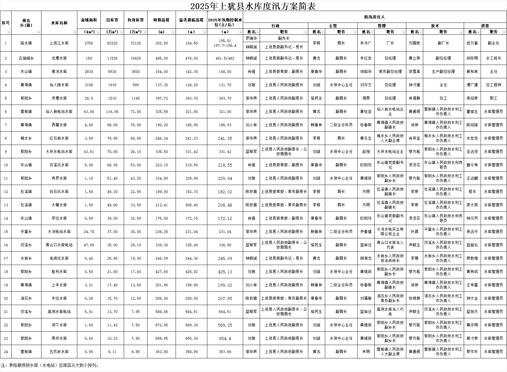 2025年上猶縣水庫度汛方案簡表