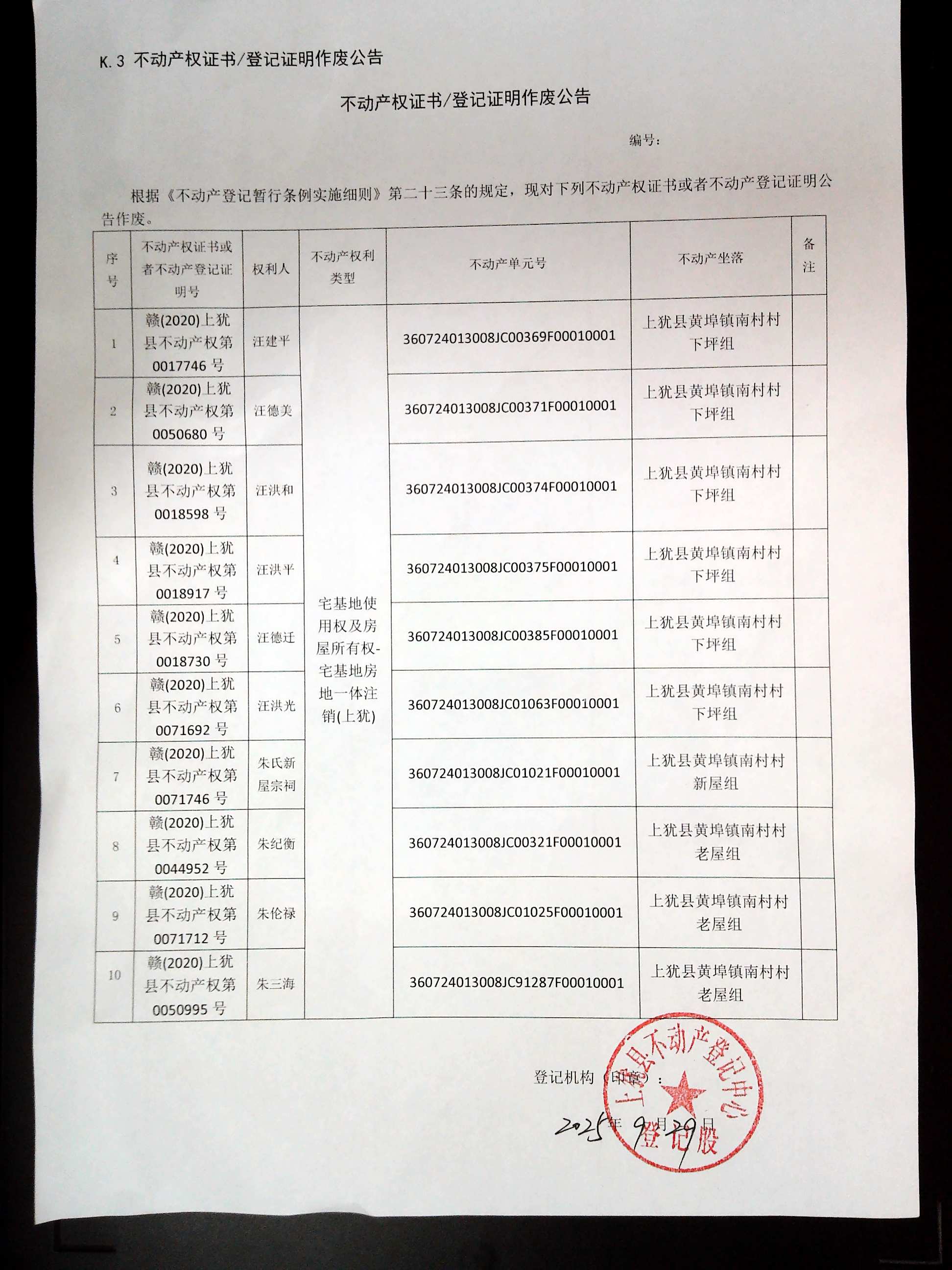 不動產(chǎn)權(quán)證書/登記證明作廢公告(汪建平、汪德遷、汪洪和、汪洪平、朱三海、汪德美、朱紀(jì)衡、汪洪光、朱倫祿、朱氏新屋宗祠)