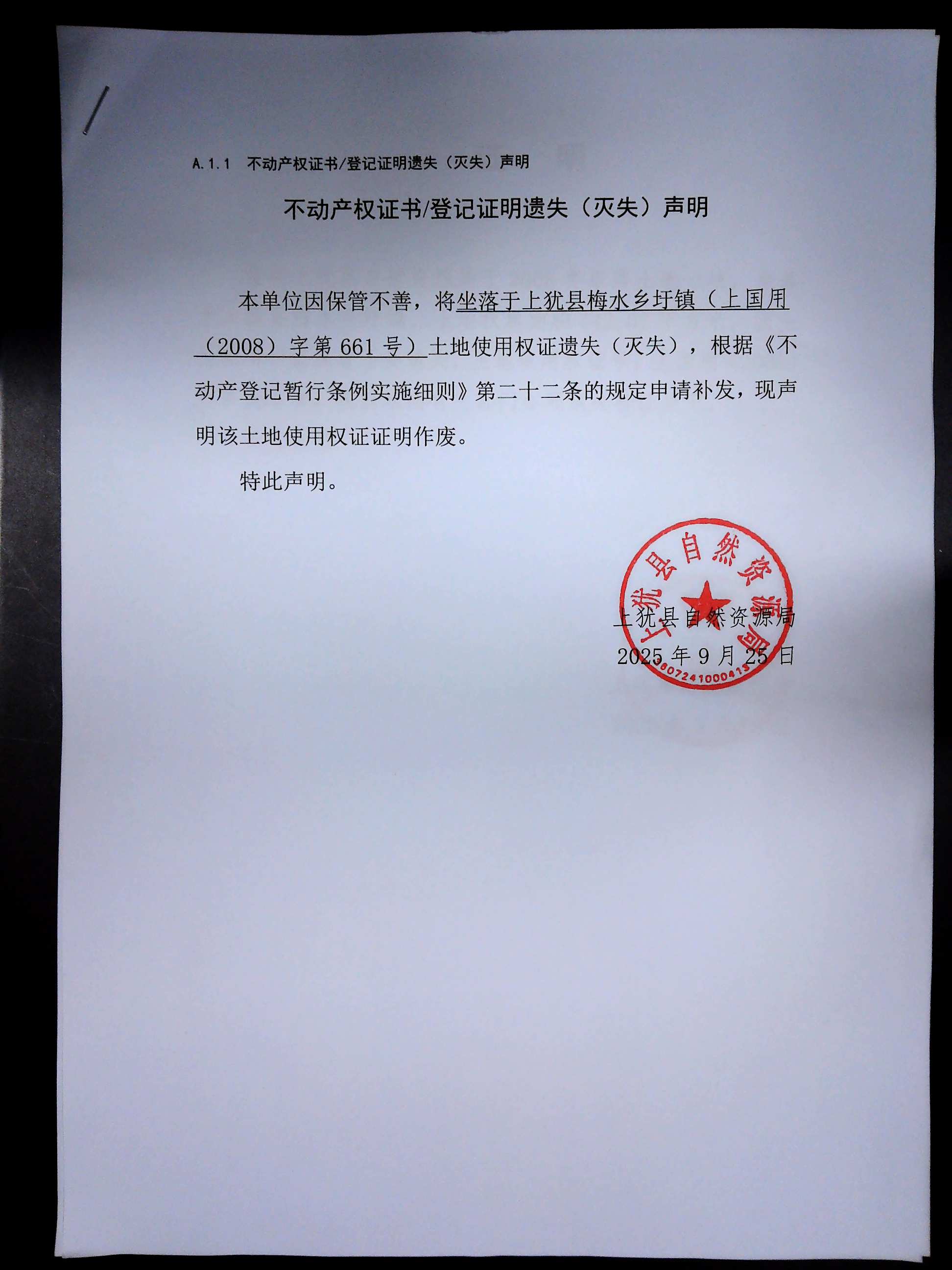 遺失公告(上猶縣自然資源局)