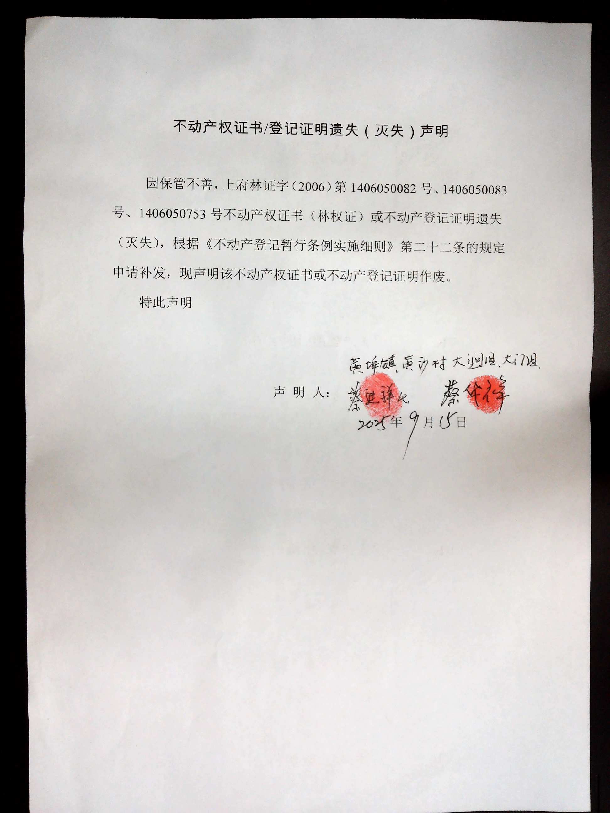 遺失公告(黃埠鎮(zhèn)黃沙村大迥組、大門組)
