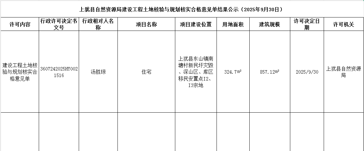 上猶縣自然資源局建設(shè)工程土地核驗(yàn)與規(guī)劃核實(shí)合格意見(jiàn)單結(jié)果公示(湯勝瓊住宅)