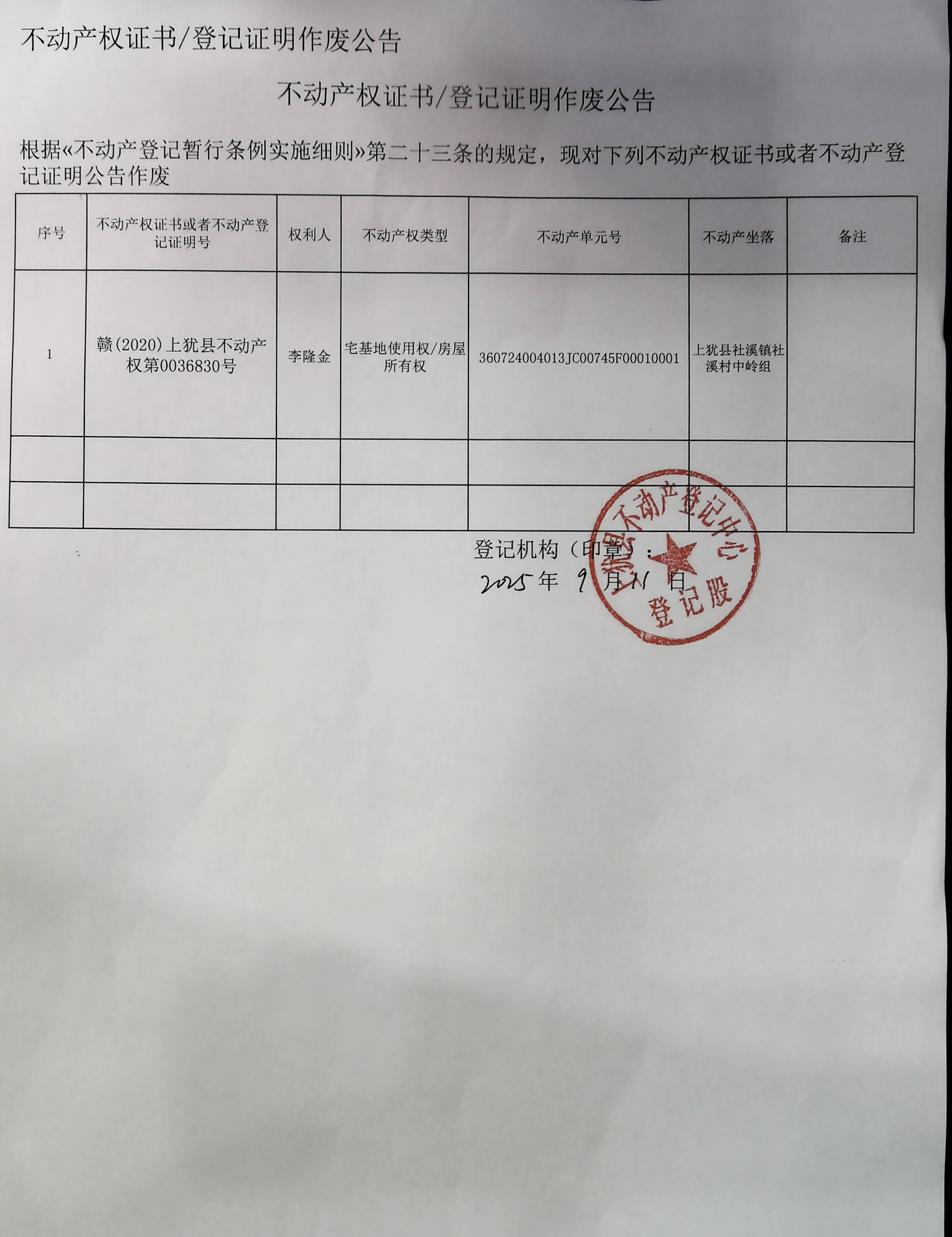 不動產(chǎn)權(quán)證書/登記證明作廢公告(李隆金)