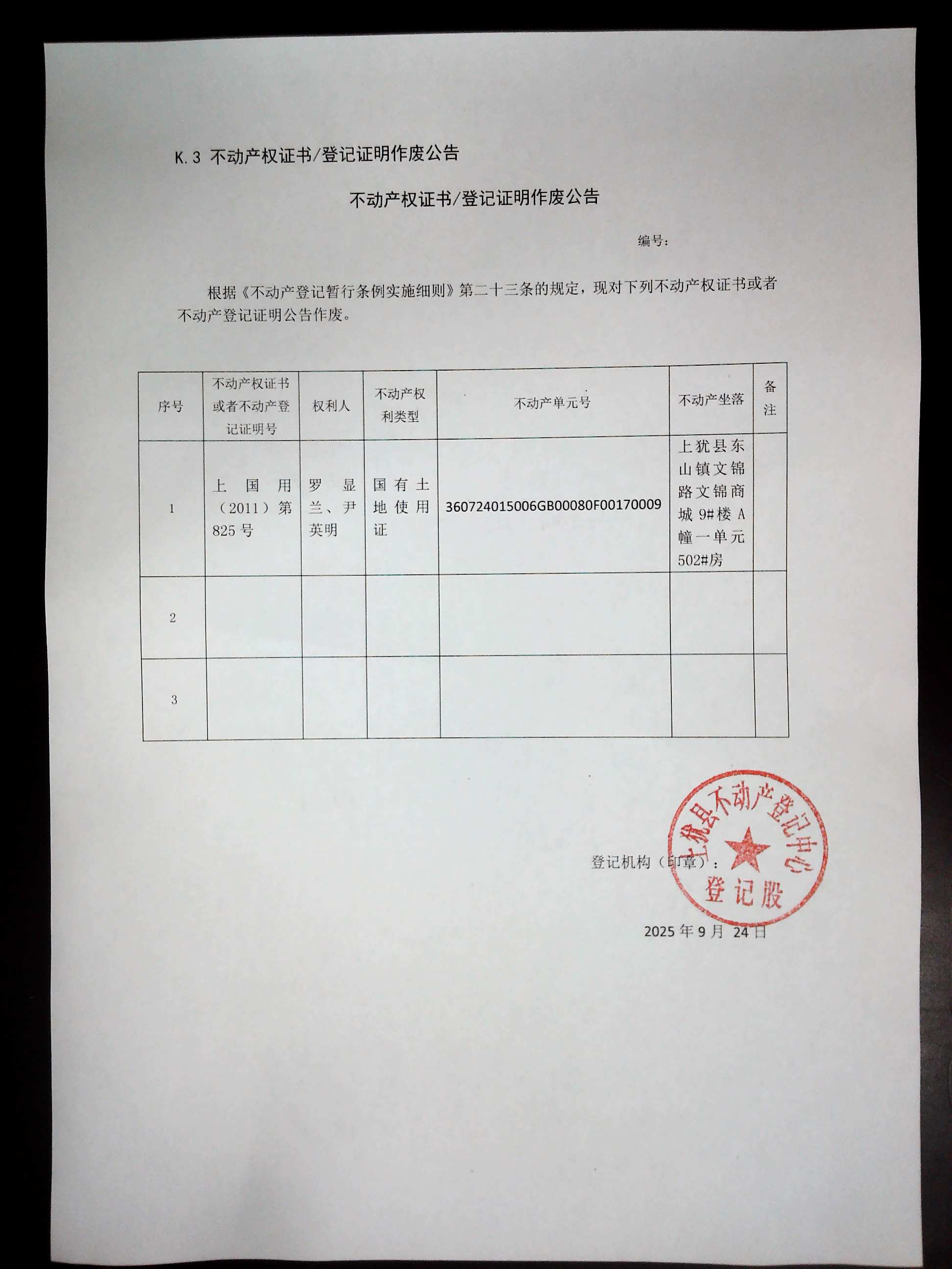 不動產(chǎn)權(quán)證書/登記證明作廢公告(羅顯蘭、尹英明)