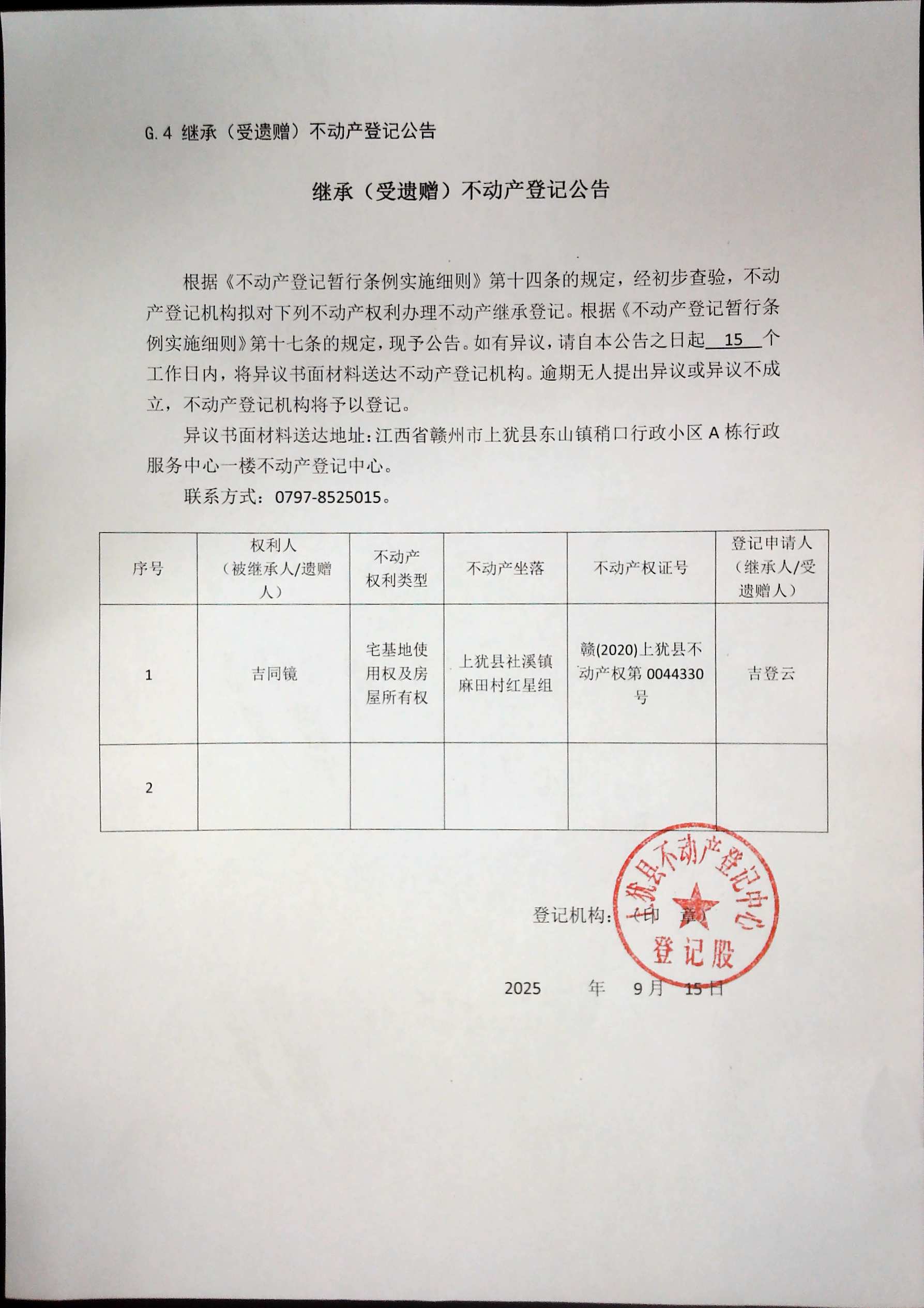 繼承(受遺贈(zèng))不動(dòng)產(chǎn)登記公告(吉同鏡)