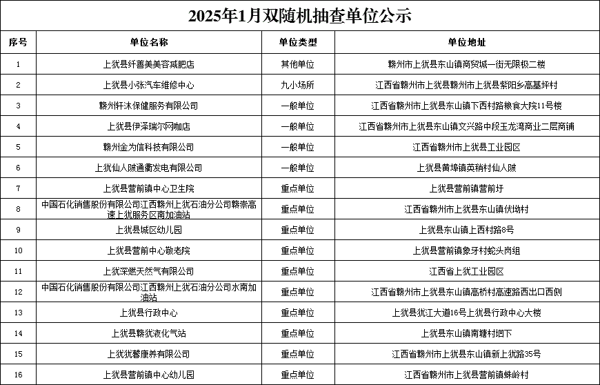 2025年1月雙隨機(jī)抽查單位公示