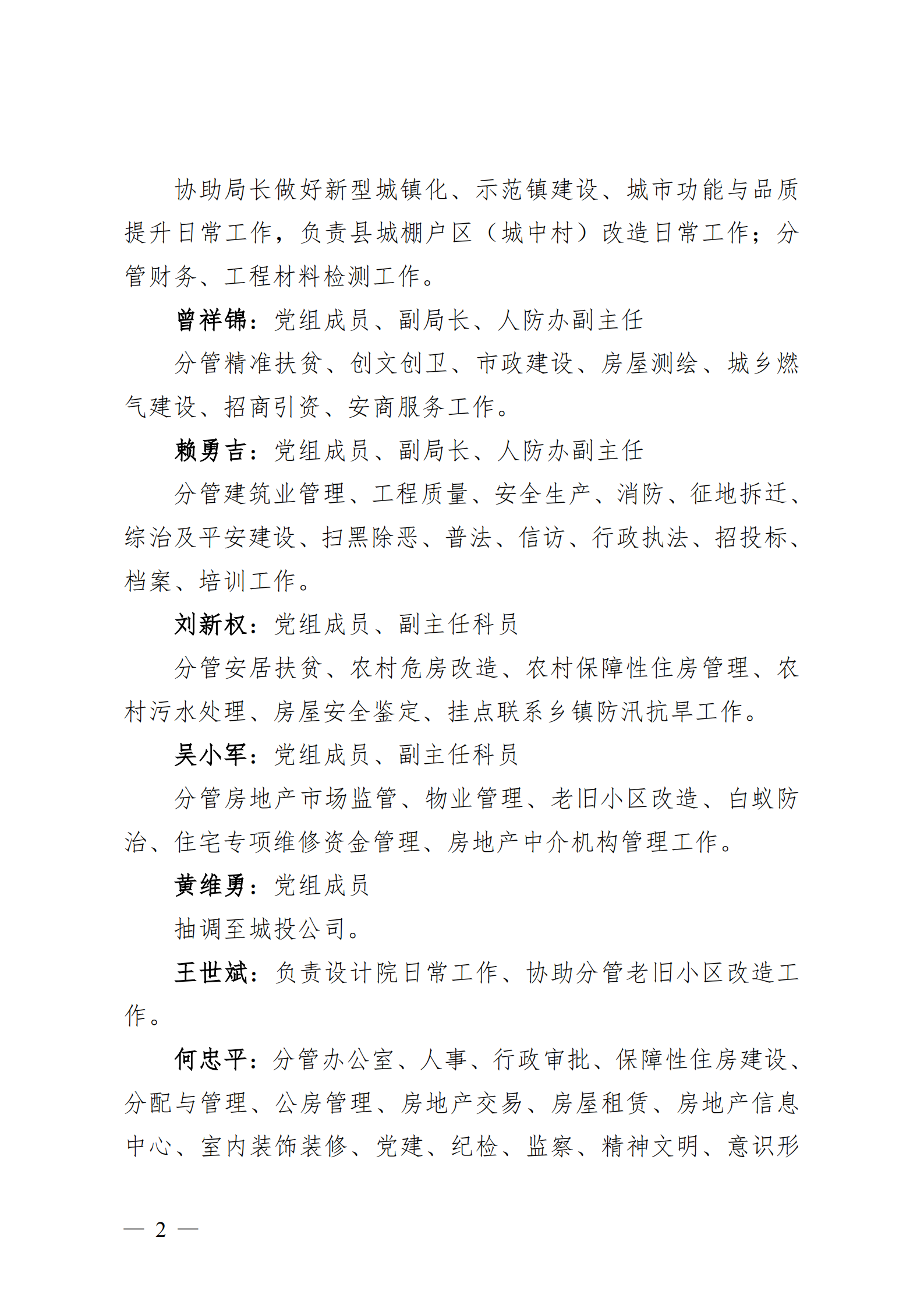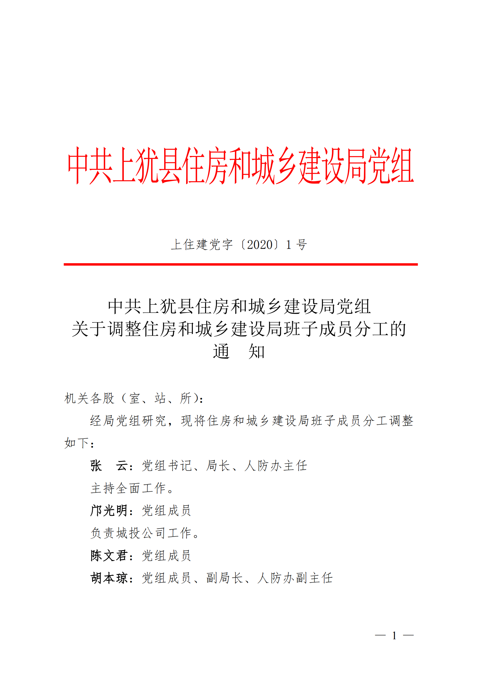 中共上猶縣住房和城鄉(xiāng)建設(shè)局黨組關(guān)于調(diào)整住房和城鄉(xiāng)建設(shè)局班子成員分工的通知
