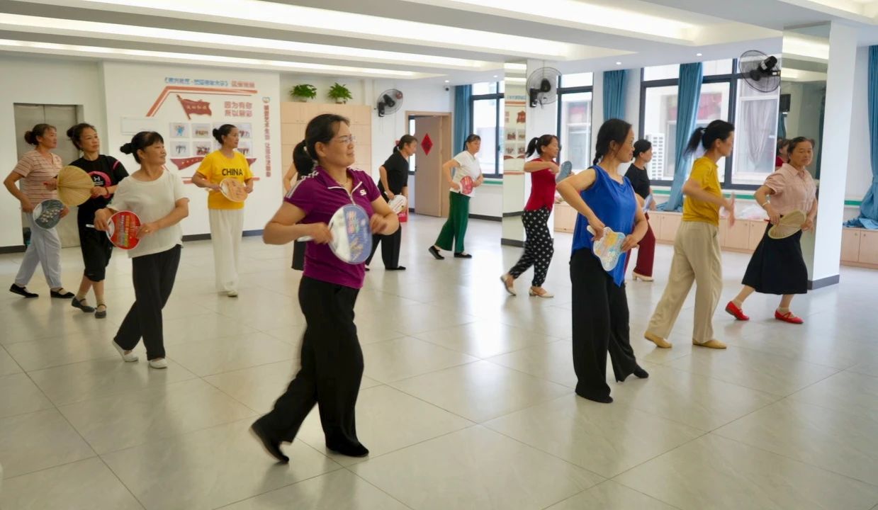 順著李奶奶的講述,記者拾級而上,剛至二樓,輕快的樂聲便悠悠入耳——寬敞的活動大廳里,阿姨們手持小扇,正跟著節(jié)奏排練新舞,躍動的舞步間,活力與笑意滿溢。視線掃過,棋牌室、圖書閱覽室、書畫室、乒乓球室、兒童活動室等功能區(qū)劃分清晰,展現著“一老一小”的生活日常。