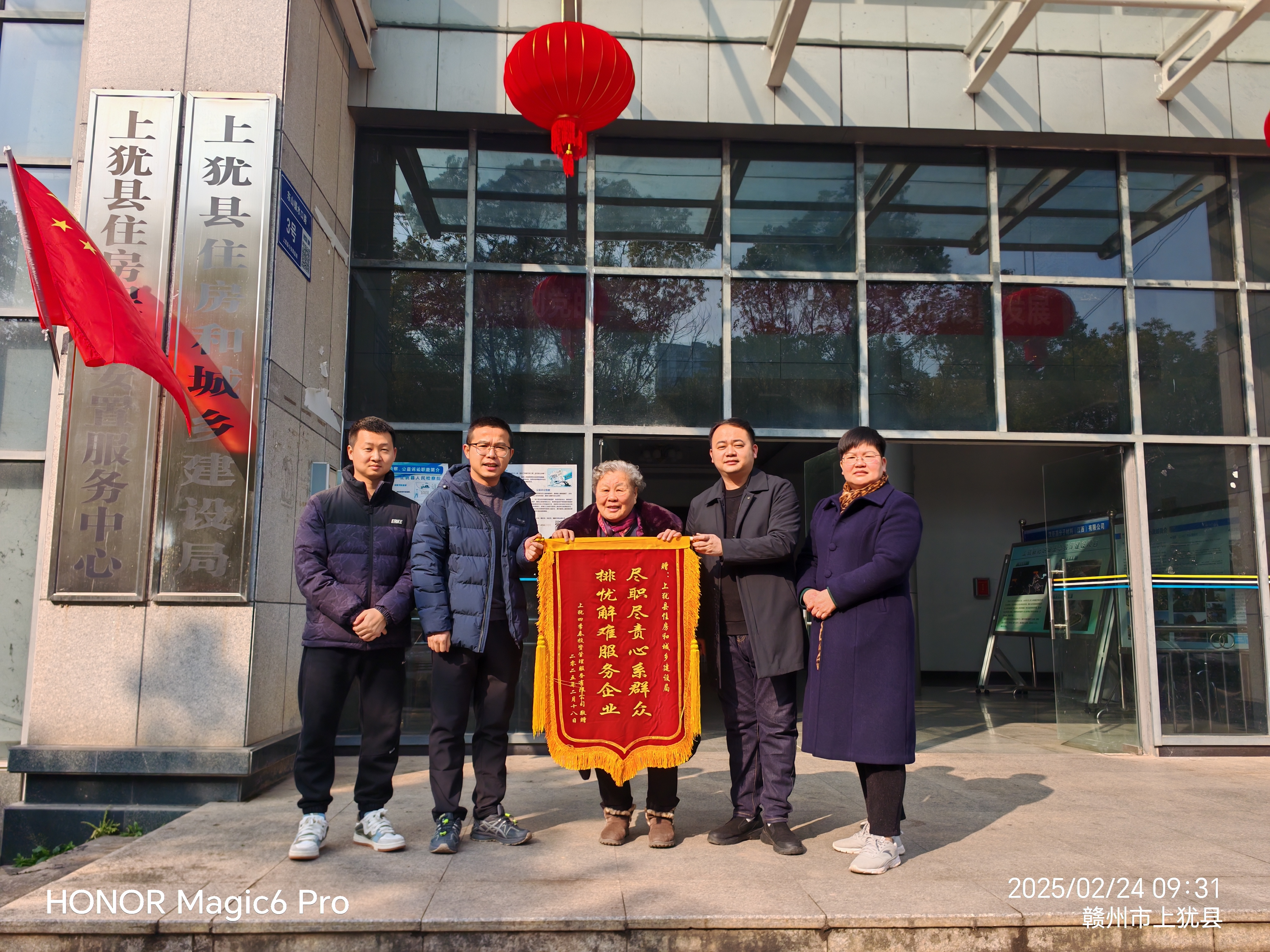 2月24日上午,上猶四季春投資管理服務(wù)有限公司負(fù)責(zé)人專程來訪,贈送錦旗,對我局在上猶四季春項(xiàng)目竣工驗(yàn)收和信訪工作中給予的專業(yè)指導(dǎo)和熱心服務(wù)表示衷心感謝。