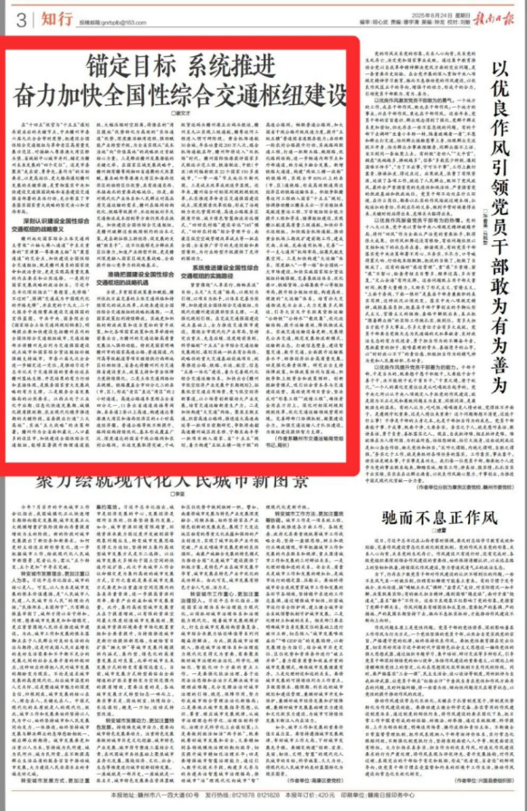 編者按:2025年8月24日《贛南日報》刊發(fā)贛州市交通運(yùn)輸局黨組書記、局長謝文才撰寫的理論文章《錨定目標(biāo)、系統(tǒng)推進(jìn),奮力加快全國性綜合交通樞紐建設(shè)》,現(xiàn)予全文轉(zhuǎn)發(fā)。