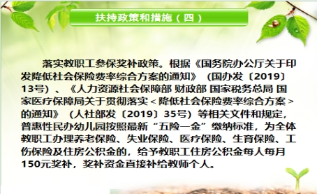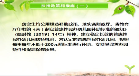 根據(jù)《省教育廳 省發(fā)改委 省財(cái)政廳關(guān)于印發(fā)<江西省普惠性民辦幼兒園認(rèn)定及扶持辦法(修訂)>的通知》(贛教基字〔2019〕 42 號(hào))、《贛州市教育局 贛州市發(fā)改委 贛州市財(cái)政局關(guān)于印發(fā)<贛州市普惠性民辦幼兒園認(rèn)定及扶持辦法(修訂)>的通知》(贛市教學(xué)前字〔2020〕1 號(hào))等文件精神,為進(jìn)一步加大對(duì)普惠性民辦幼兒園扶持力度,鼓勵(lì)多種形式擴(kuò)大普惠性學(xué)前教育資源,保障適齡兒童接受有質(zhì)量的學(xué)前教育,特出臺(tái)此若干措施。
