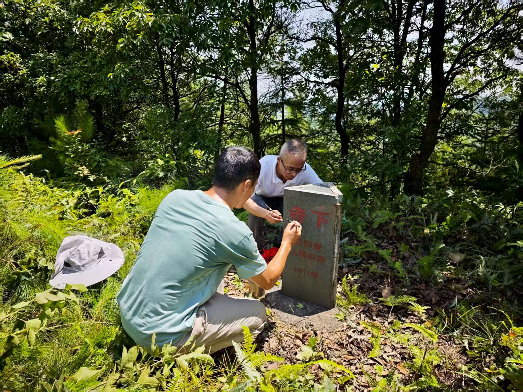 8月11日,民政局派出工作人員深入寺下鎮(zhèn)對寺下、紫陽、安和三交點界樁進行實地逐點、逐段詳細核對界線,并用紅色油漆對界樁文字進行了重新描繪,寺下鎮(zhèn)鎮(zhèn)村村干部協(xié)同開展此項工作。